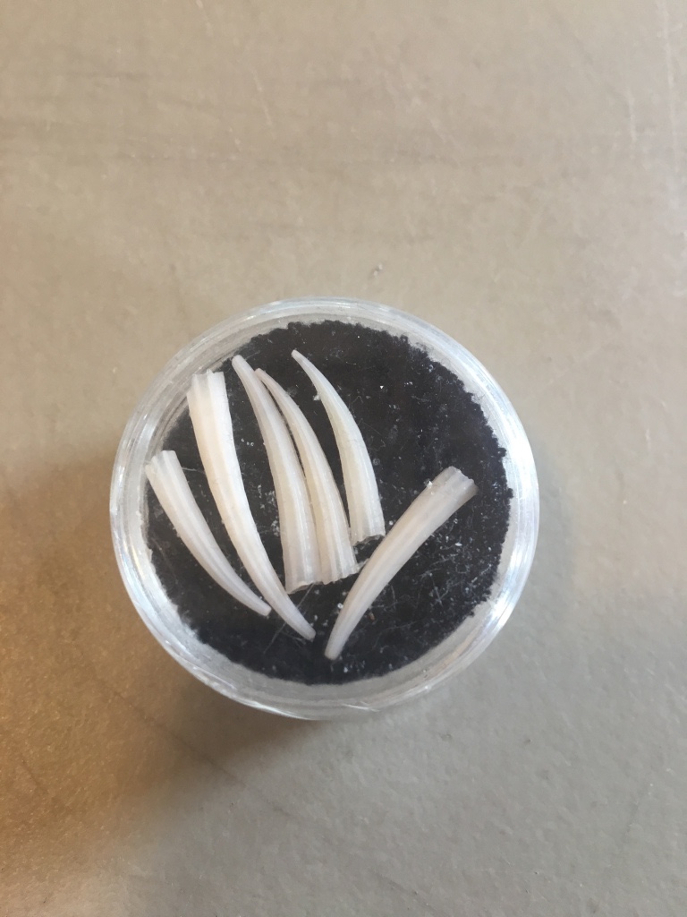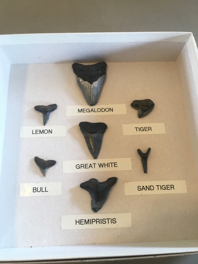Figure 79:A series of labelled shark teeth located on Barefoot Beach during a beach combing activity carried out by Jimmy Trulock. Each specimen comes from a variety of different shark species, ranging in size from smaller species to larger species.